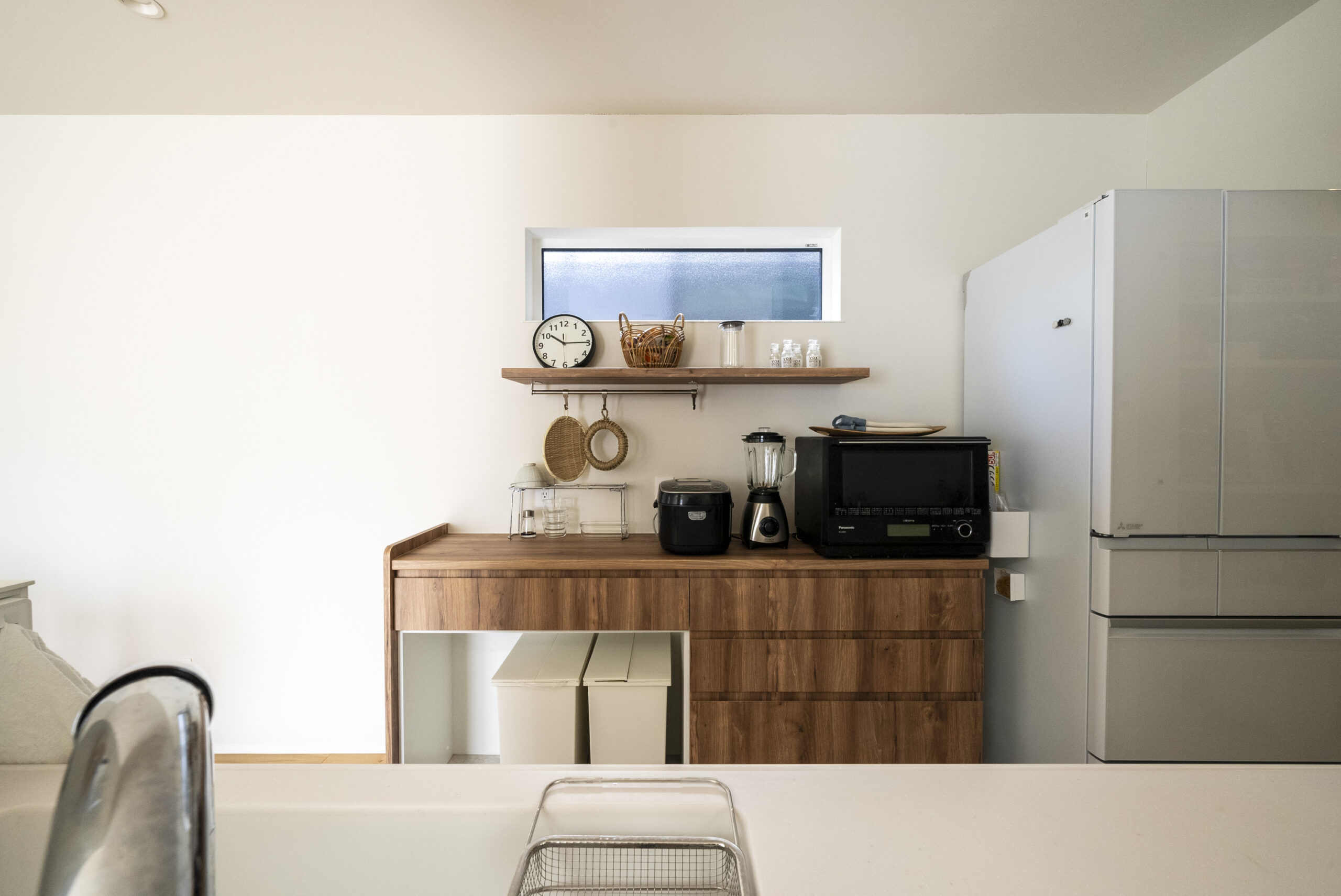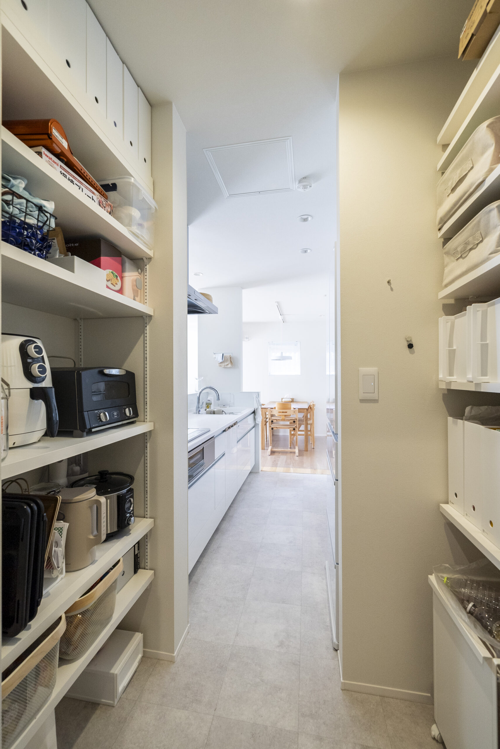 • キッチン隣にパントリーを設けて食品や日用品のほかにも家電を並べて収納を工夫