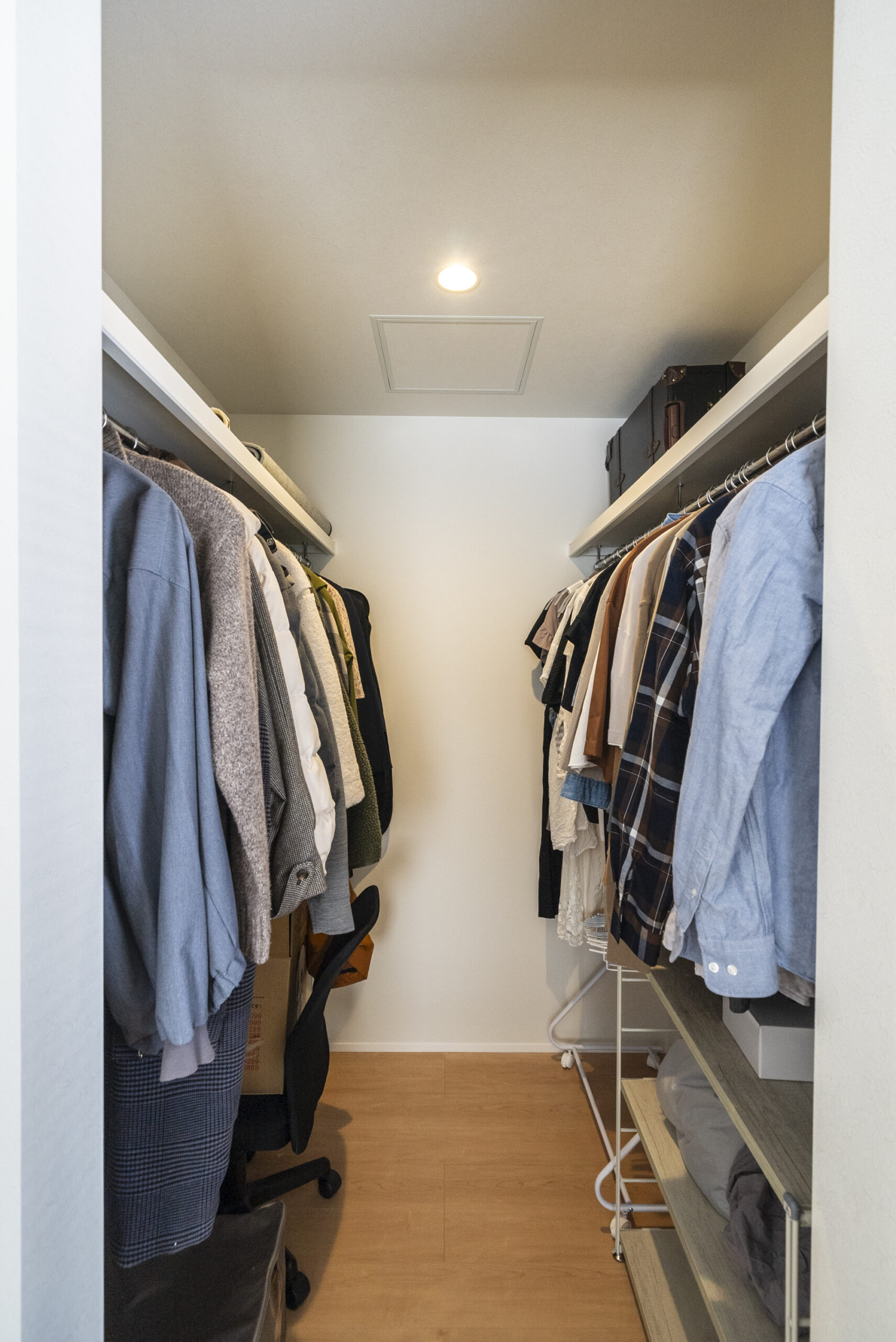 • ご夫婦のクロークは中央に通路をつくり両側に衣類を掛けられてすっきり