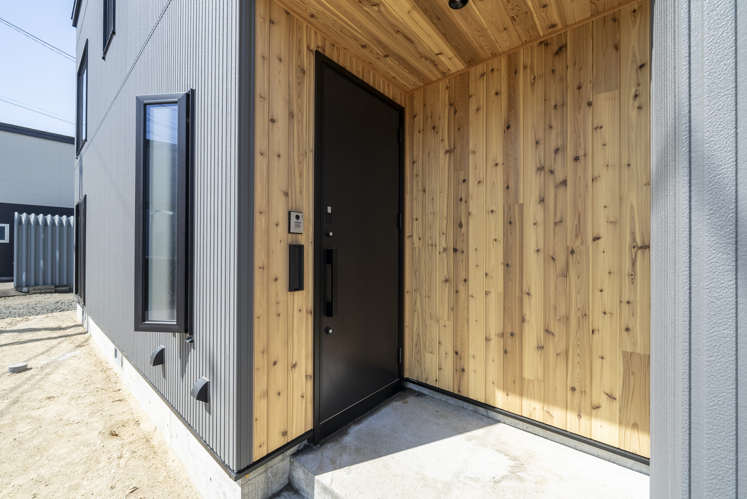 • ポーチの壁と天井は素材感が際立つアイテムを選び外観の印象も◎
